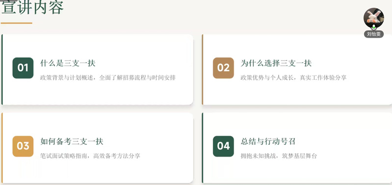 刘怡雯结合自身报考经验与任职经历,对“三支一扶”计划的政策内容、报考流程、备考策略与发展优势进行了全面解读。重点介绍了该计划在薪资待遇、政策倾斜、就业发展等方面的优势。刘怡雯结合自身工作实际谈到,学前教育专业学生所具备的活动策划经验、多任务处理能力与沟通协调能力在基层行政、宣传、群众工作中极具优势,鼓励同学们打破专业局限,勇敢尝试多元就业岗位。