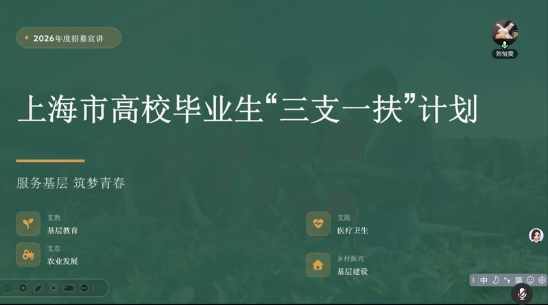 为拓宽学生就业视野,引导毕业生积极投身基层服务,2月4日下午,学院于线上开展上海市高校毕业生“三支一扶”计划分享会。本次分享会邀请了2023届学前教育专业校友刘怡雯,学院党委副书记、副院长周泽龙,学工办主任严雅琴,本科生毕业班辅导员何坤鹏以及各年级学生代表共50余人参与,分享会由严雅琴主持。